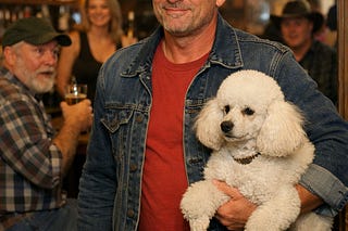 a man carrying a poodle